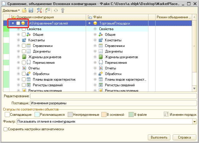Перед объединением необходимо убедиться в том что новая конфигурация поставщика не перезатирает доработанный программный код переопределяемого модуля. Если такой код присутствует в методах - необходимо снять флажки с данных методов (или модуля) при объединении.