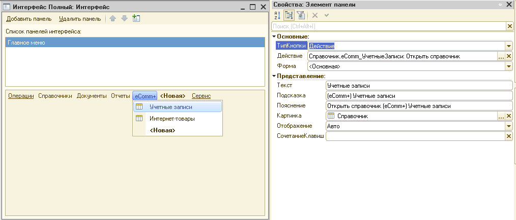 Добавим в интерфейс «Полный» (или какой-либо другой требуемый интерфейс) пункт «eComm» с пунктами: